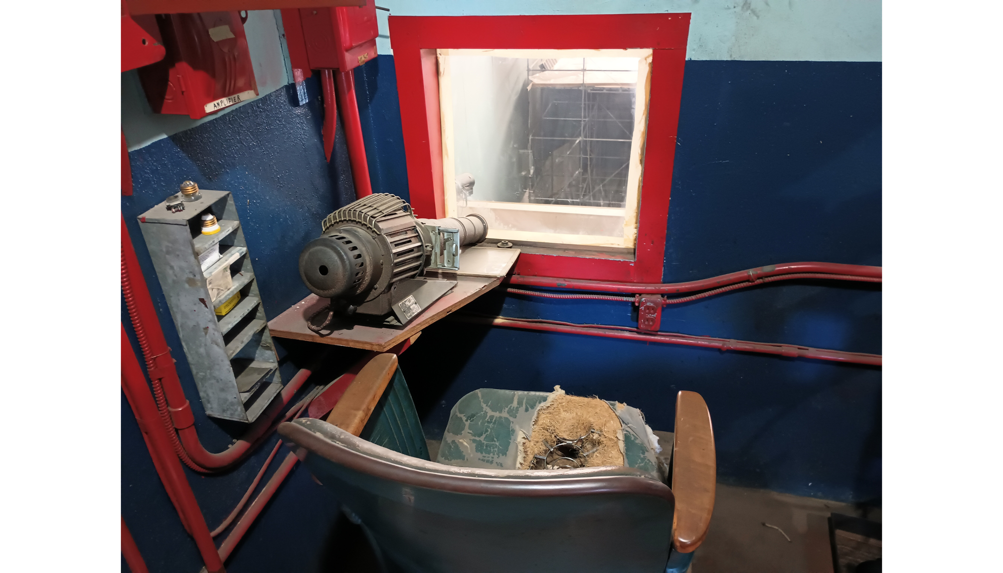 Underneath the projection booth's only window is a film table where the projectionist splices together reels of film to produce a seamless movie. When movie studios shipped movies to theaters like The Rex a single movie would arrive on four small reels. The projection booth manager would then "paste" the filmstrip together, end-to-end, so the movie would be a full-length feature instead of something watched in four short parts.