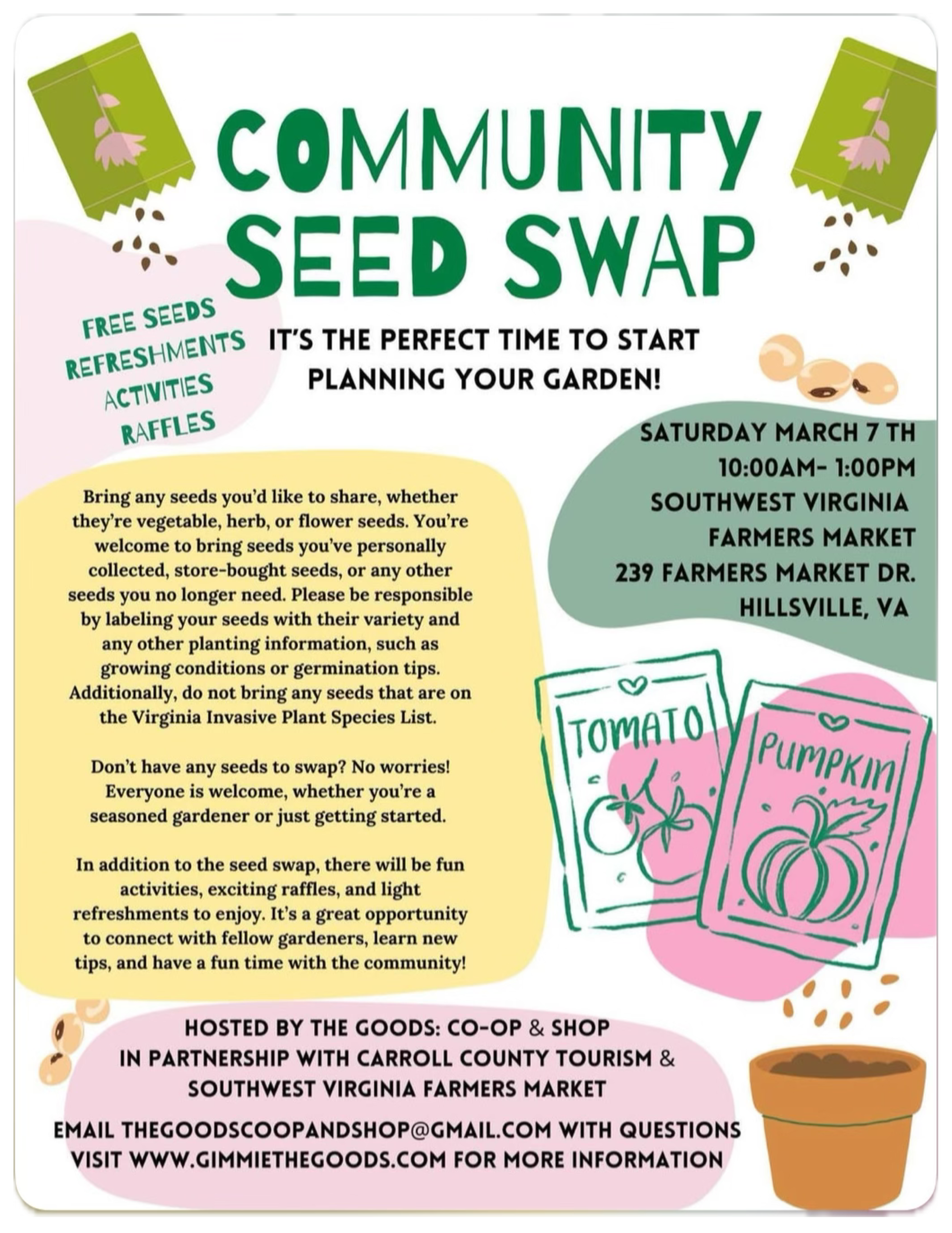 The Seed Swap is hosted by The Goods: Co-op & Shop in partnership with Carroll County Tourism, and Southwest Virginia Farmers Market. Learn more about The Goods: Co-op & Shop by visiting their website today: https://www.gimmiethegoods.com/