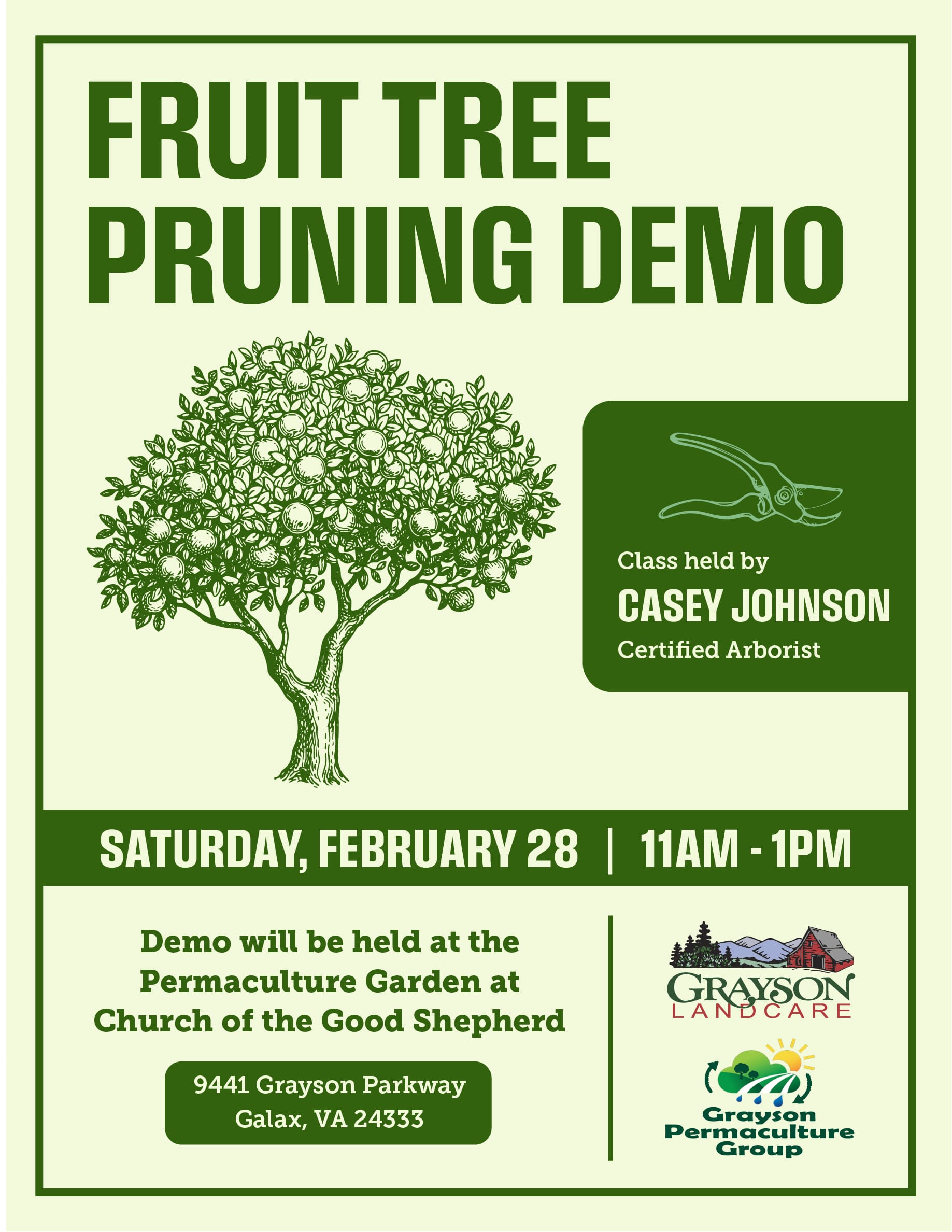 Join certified arborist, Casey Johnson, for a demonstration this Saturday from 11AM-1PM and learn how to determine which branches to cut and where to trim. This program is made available through Grayson Landcare. Reach out to them if weather is pending.