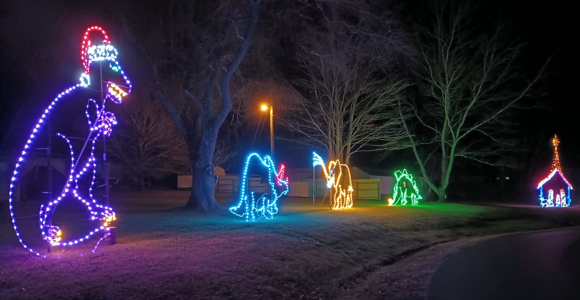 Merriment was shared by all in attendance. Lighted snowflakes blinked among treetops; a gentle nativity scene crested a gentle slope; dinosaurs and an elephant marched across Creekview's manicured lawns; funny scenes with Santa's sleigh getting pulled by a tow truck and another with a chilly elf warming up by a campfire - all, were a delight to behold.