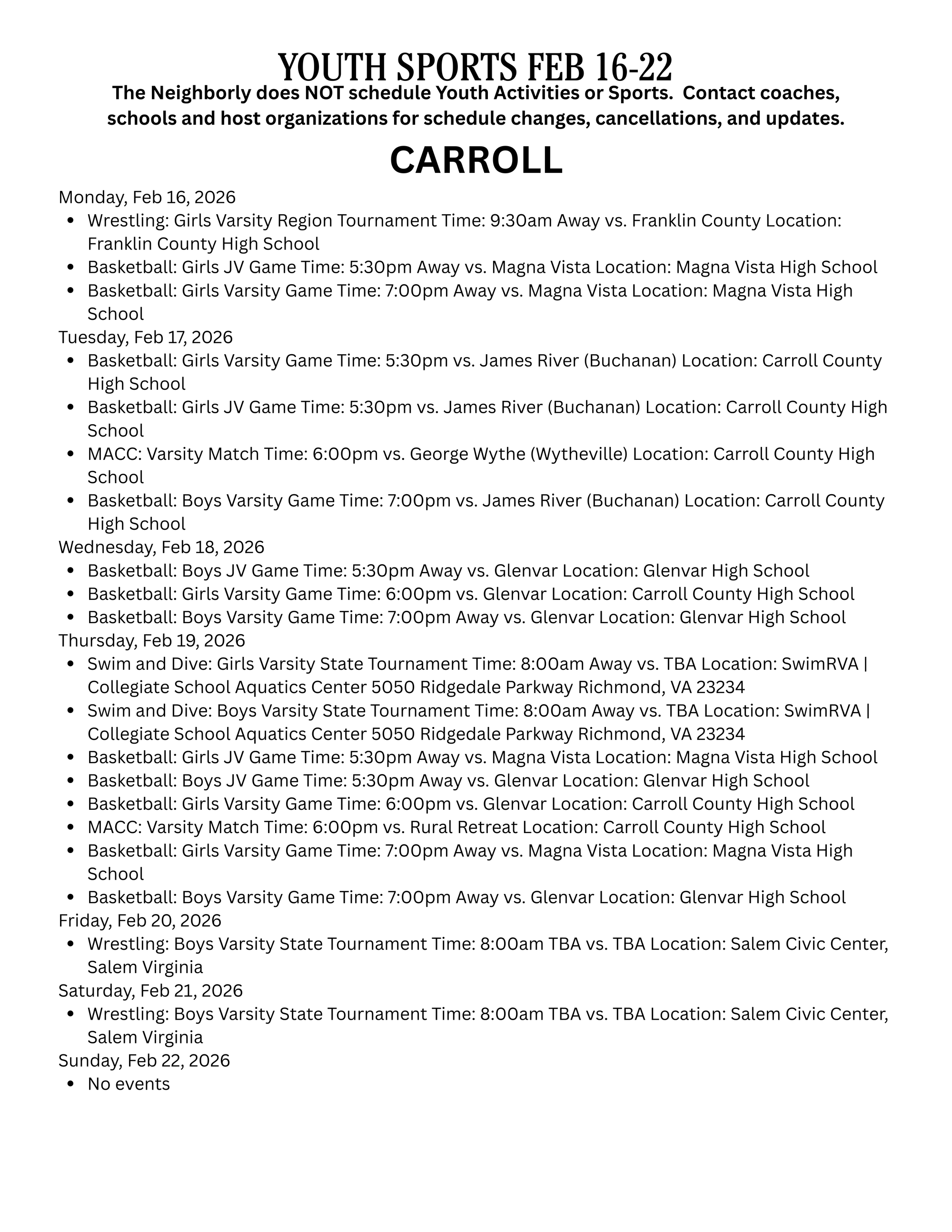Check with schools, coaches, host organizations for any schedule changes or game updates!