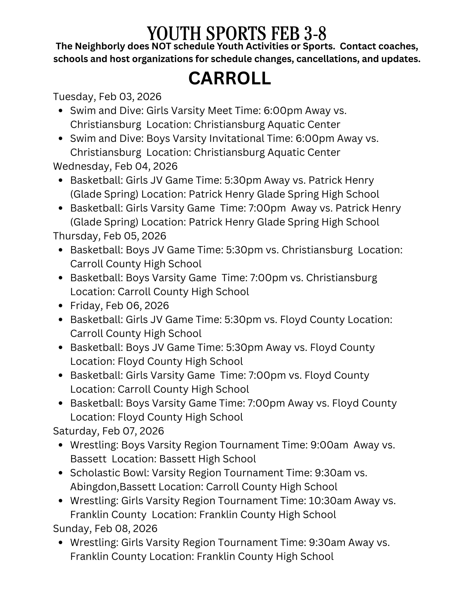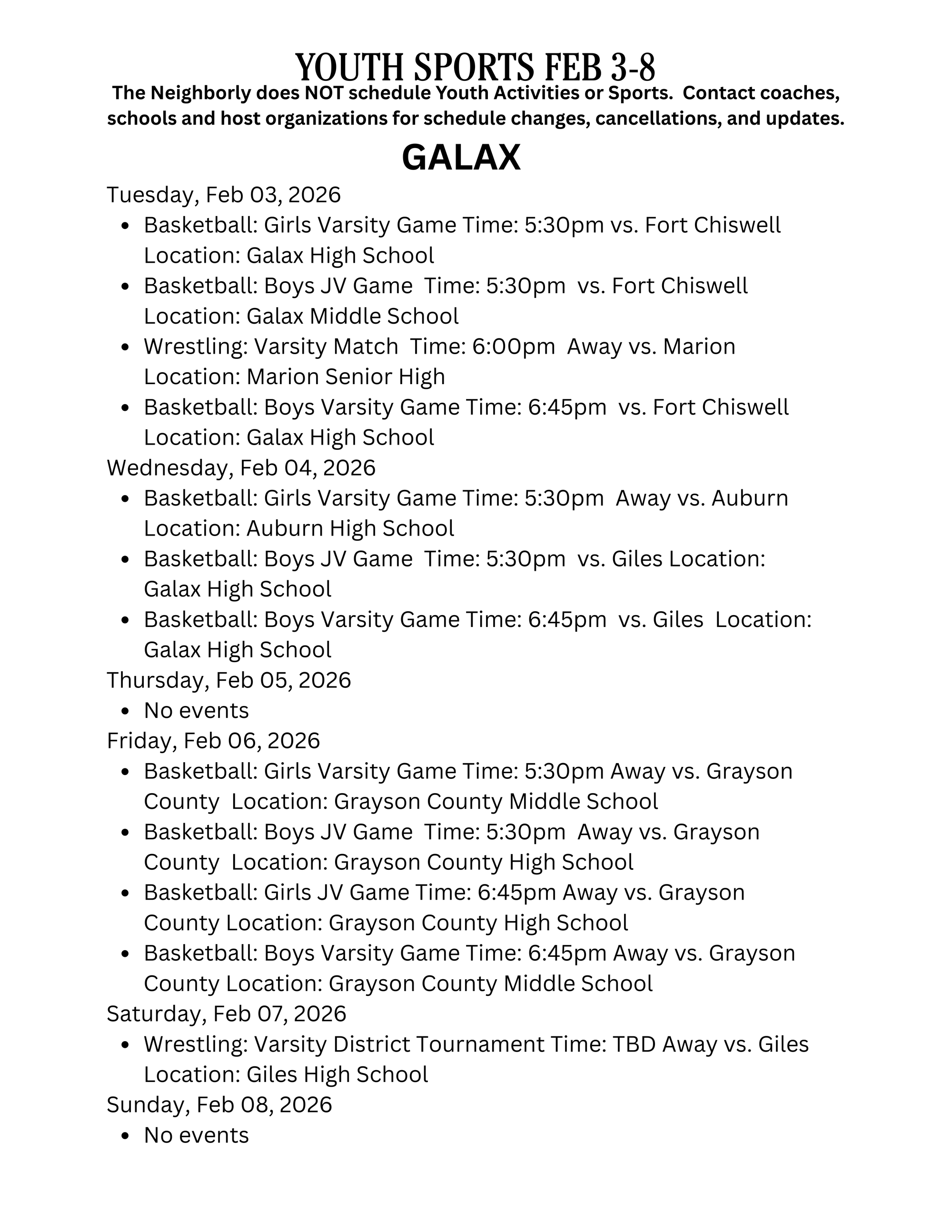 Check with schools, coaches, host organizations for any schedule changes or game updates!